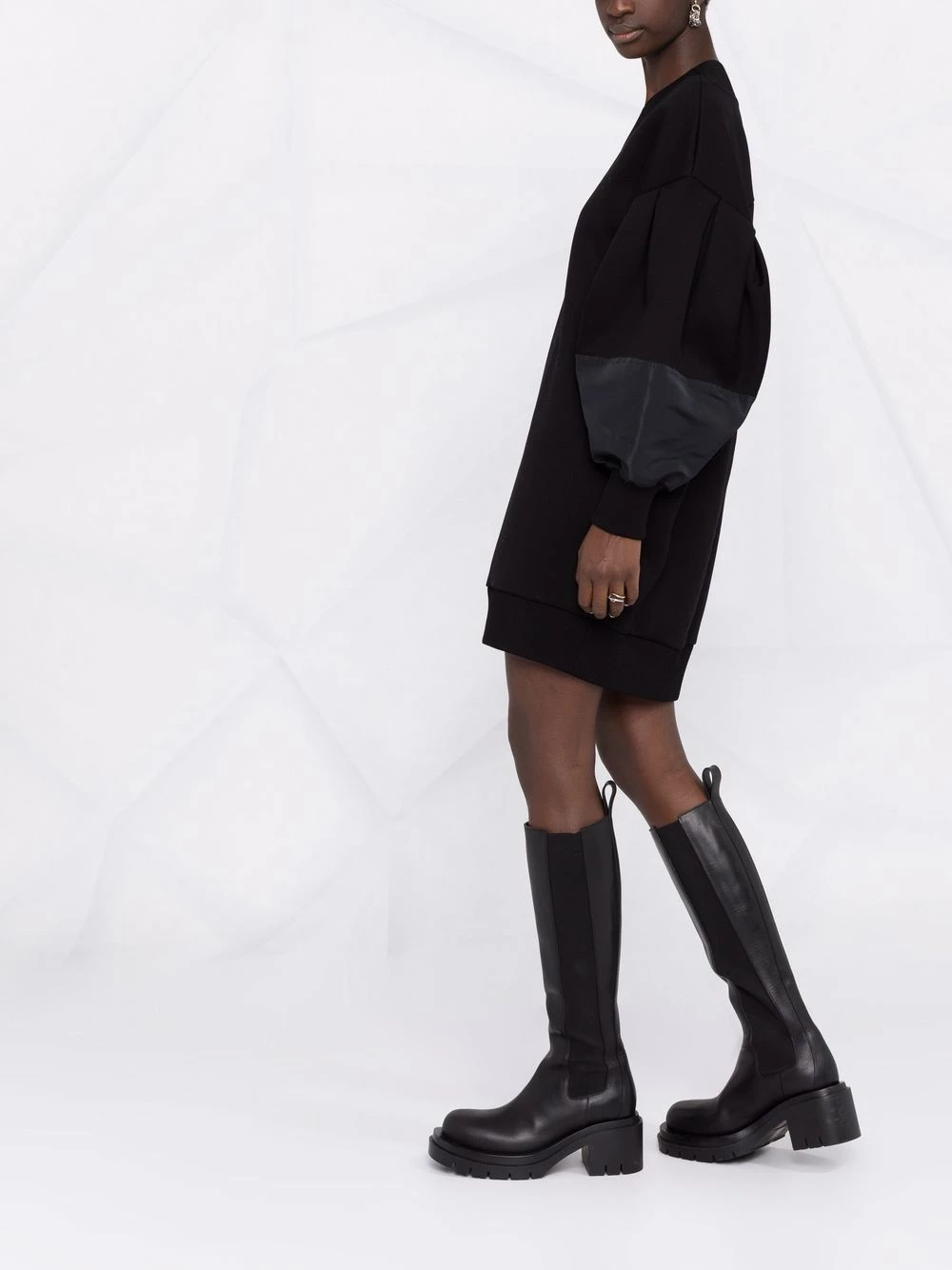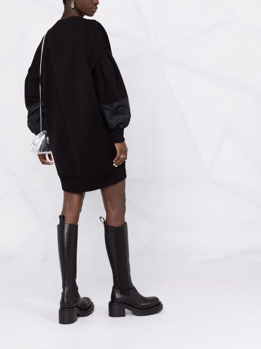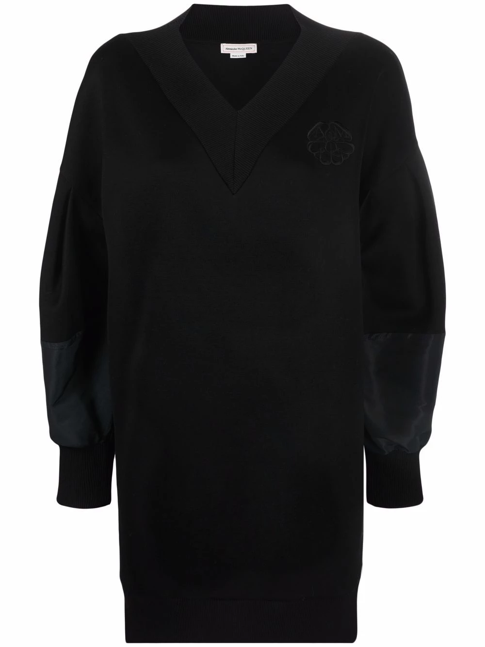 Defined by its long balloon sleeves and V-neck design, Alexander McQueen’s sweater dress is produced in a panelled design. The tonal creation features a brand emblem embroidered at the chest and a ribbed edge, showcasing the brand’s street-style edge.