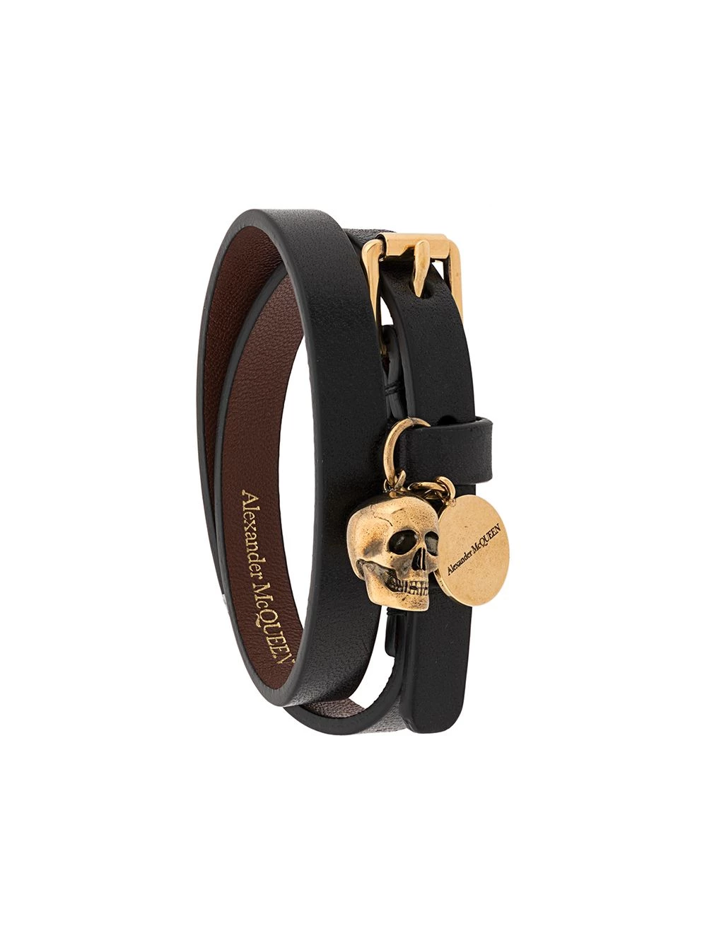 Incorporate Alexander McQueen’s signature skull motif into everyday looks with this black leather double wrap bracelet featuring antique effect gold-tone hardware, an adjustable fit, a buckle fastening, a signature skull charm and an engraved logo charm.