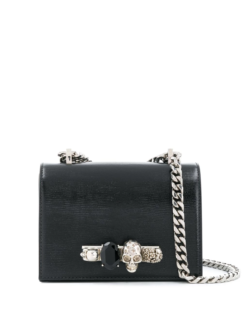 Alexander McQueen masters the art of adornment with this Jewelled lizard-effect cross-body bag. Made from leather, this structured accessory can be carried by the chain and leather strap, or using the four-ring adornment encrusted with Swarovski crystals. Embellish your look.