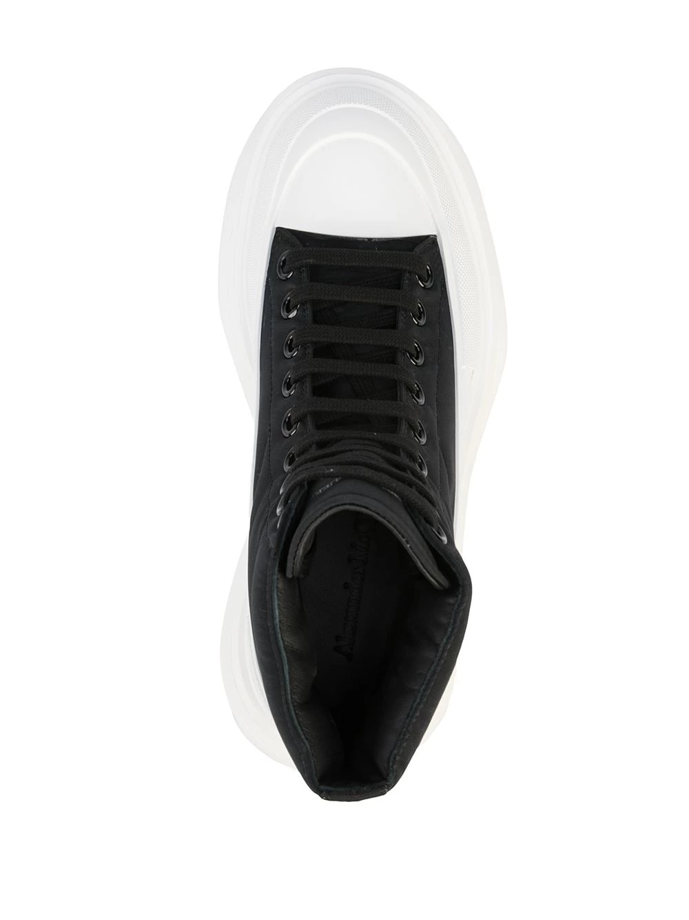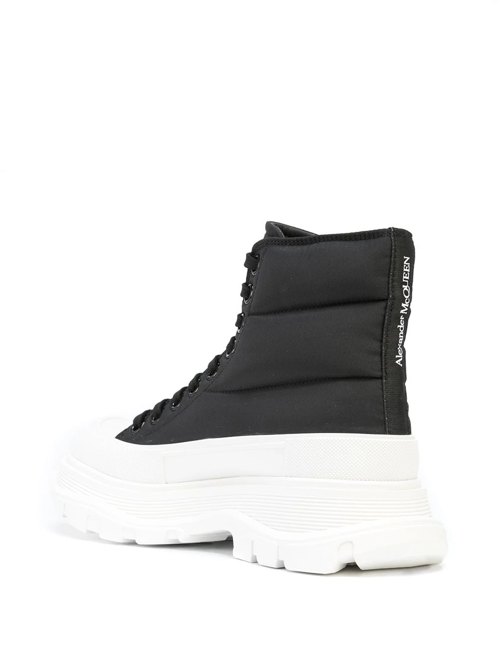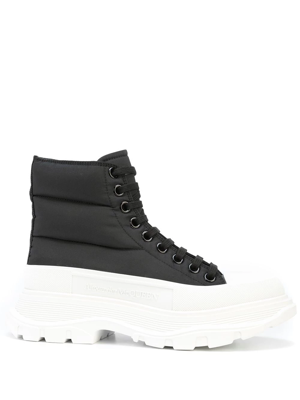 Alexander McQueen is known for innovative and impeccable technical construction. Shown on this pair of ankle boots, exaggerated details such as padded panelling and a chunky ridged rubber sole add to the boldness of the design.