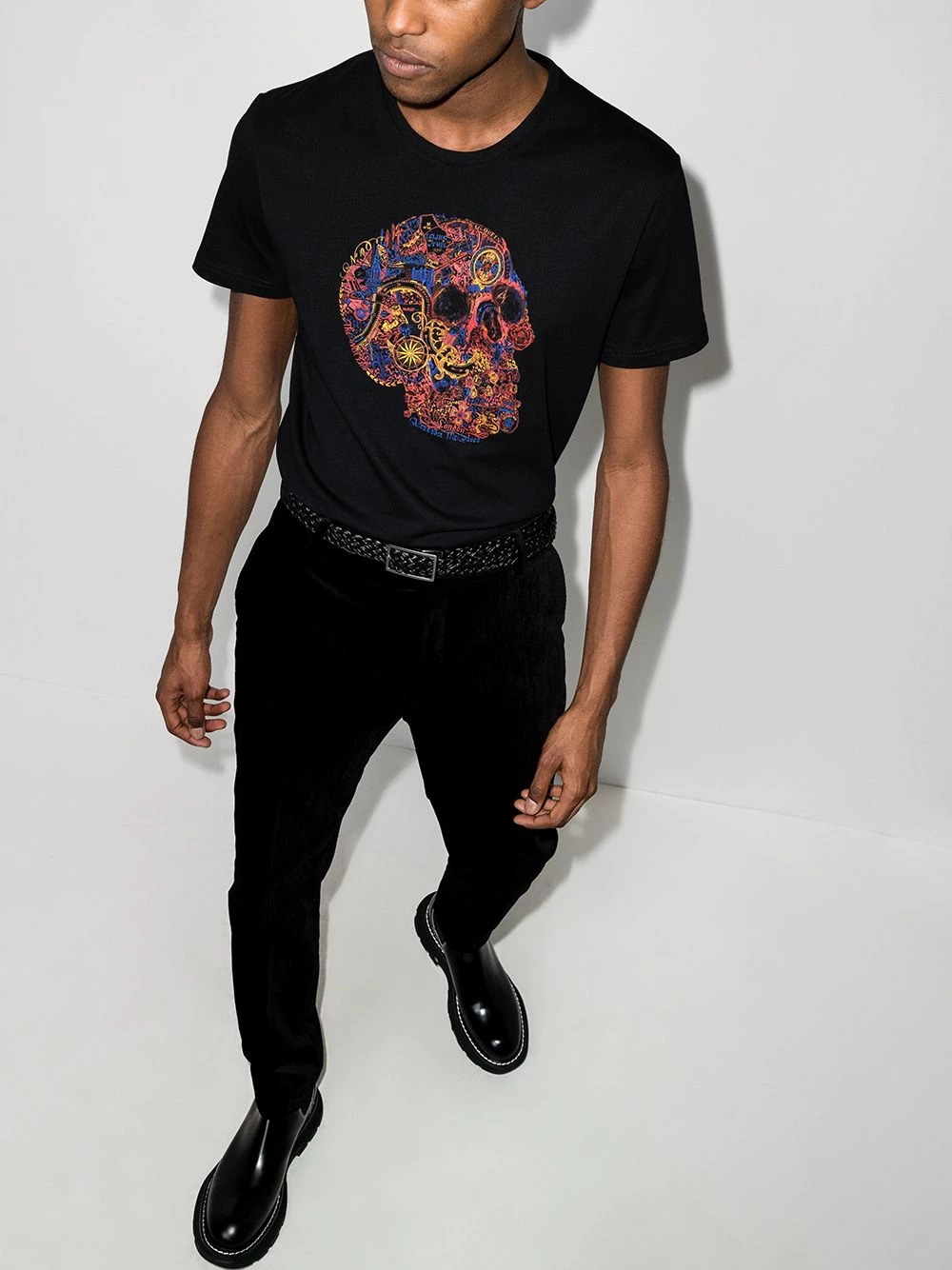 Live the London life. Printed with a skull motif made up of iconic English landmarks, this T-shirt from Alexander McQueen celebrates the brand’s founder and his heritage as a native to the capital city.ย