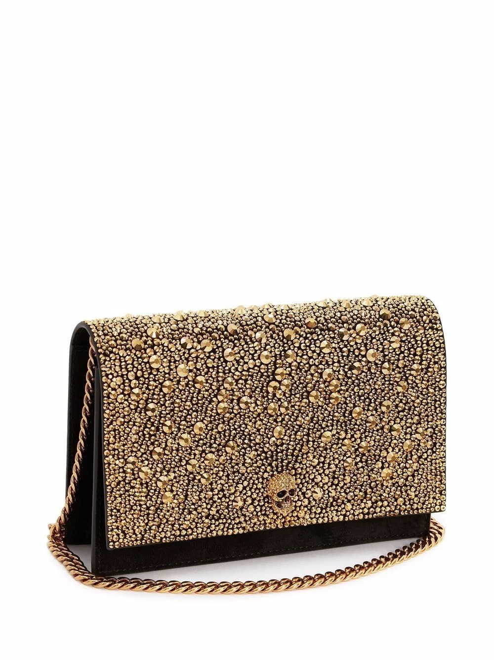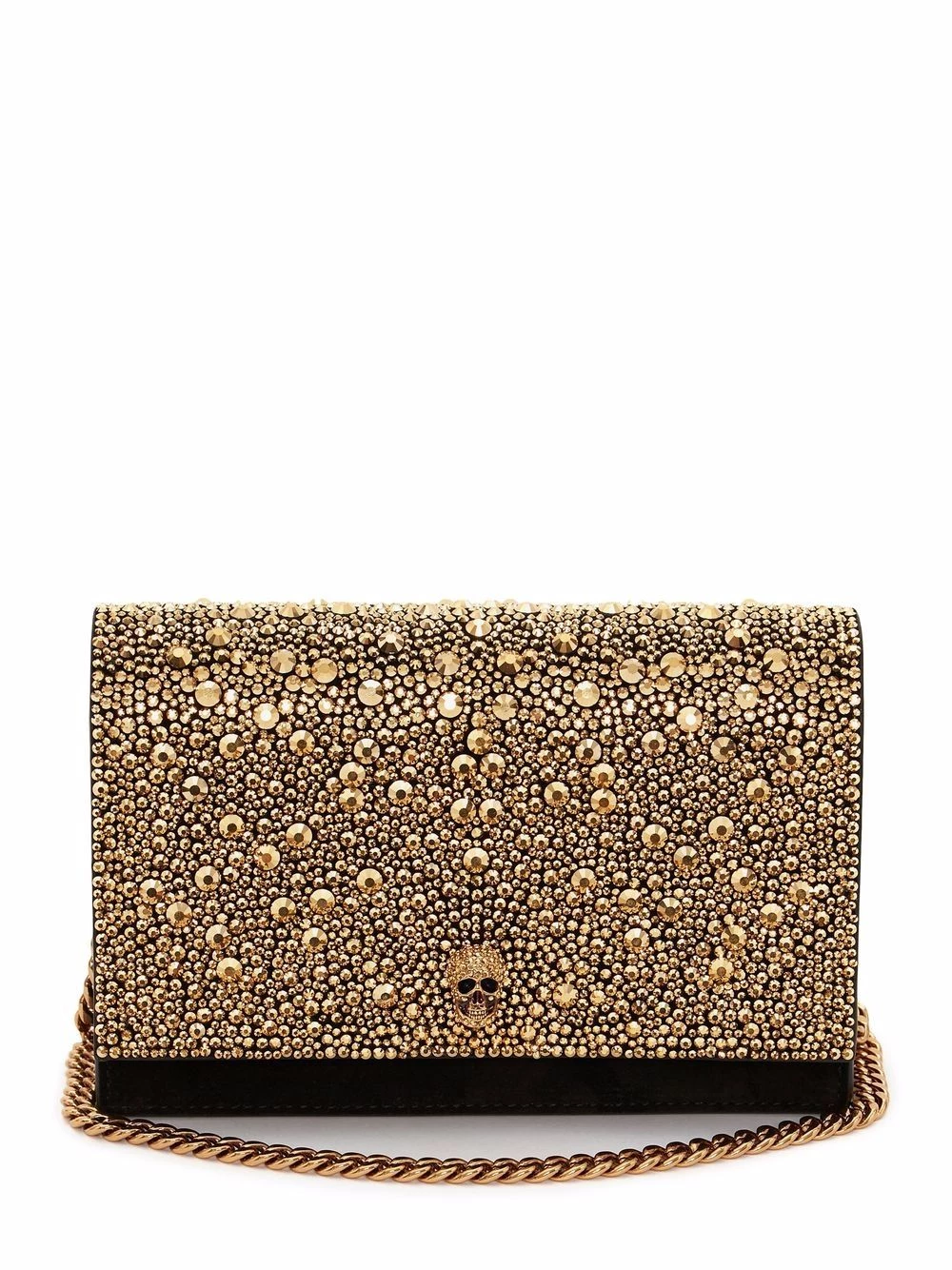 The skull charm is a signature of Alexander McQueen and makes an appearance on this iconic shoulder bag. This iteration arrives in black leather, embellished with gold-tone crystals for a striking finish.