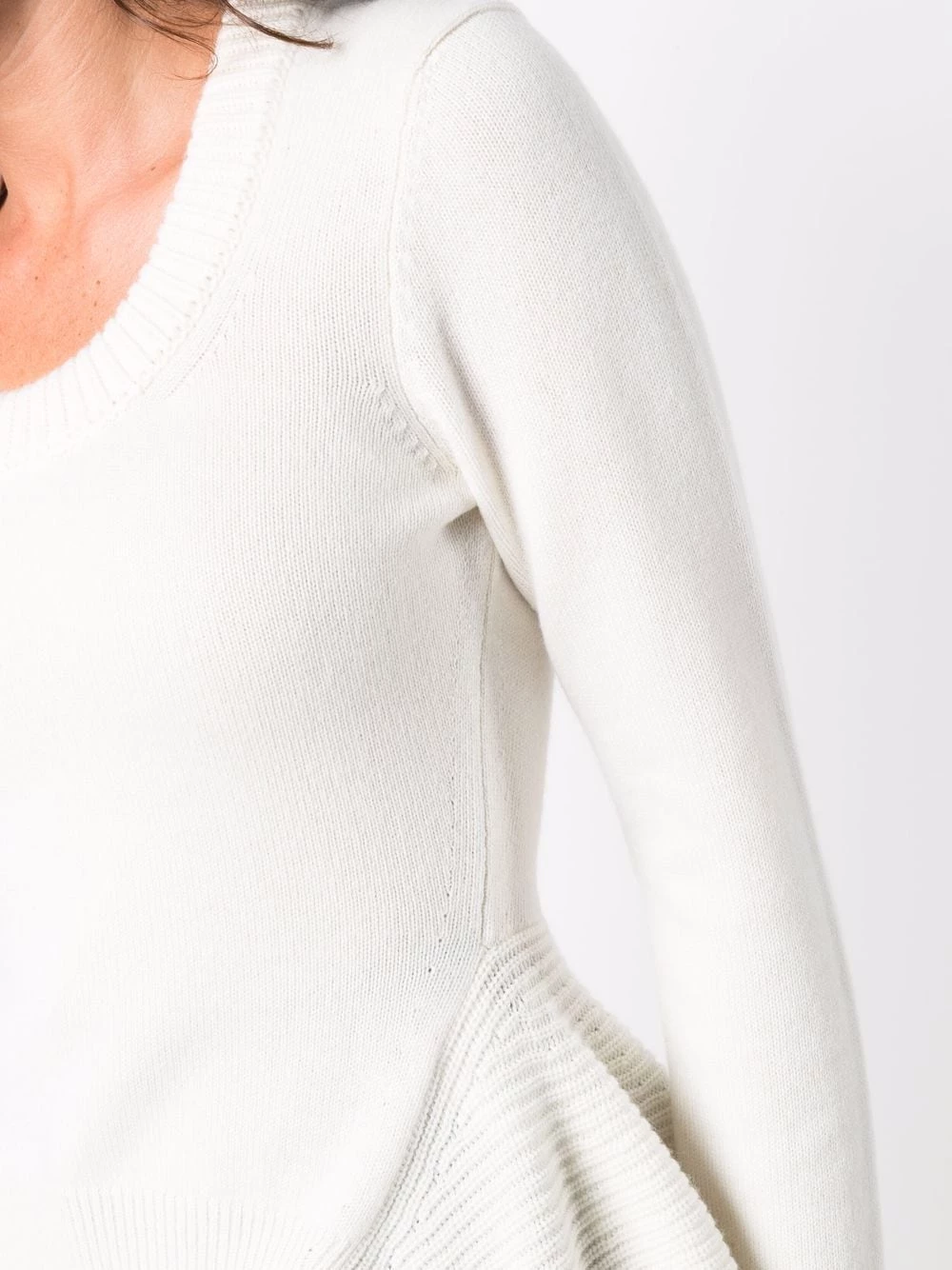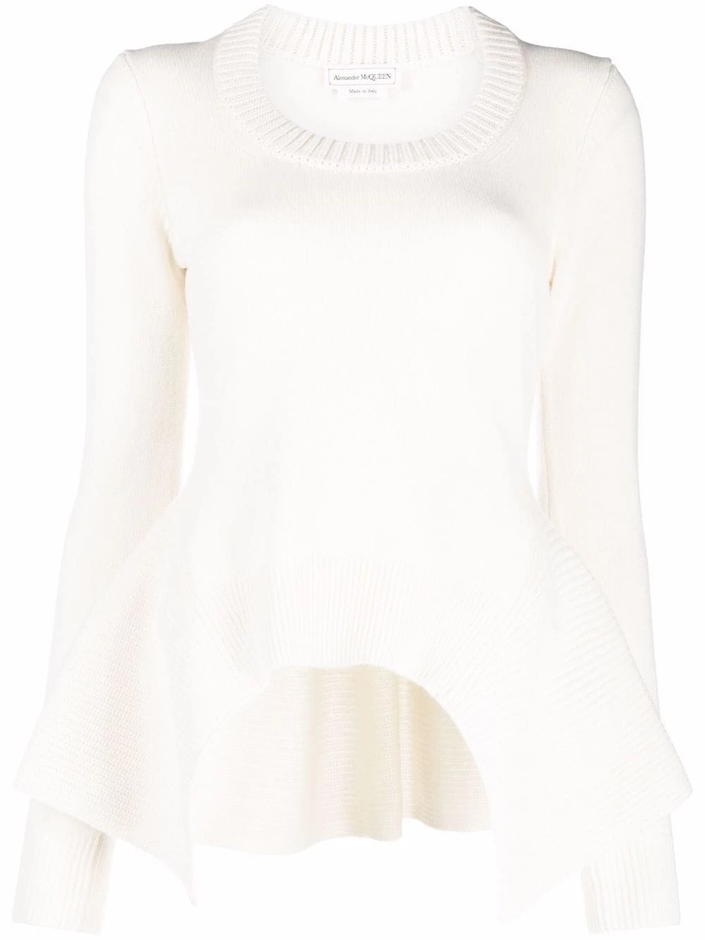 Alexander McQueen reinterprets the classic jumper in this flared iteration, presented as part of their AW21 collection. Its cashmere-made design has been shaped with a peplum hem for a charming look.ย
