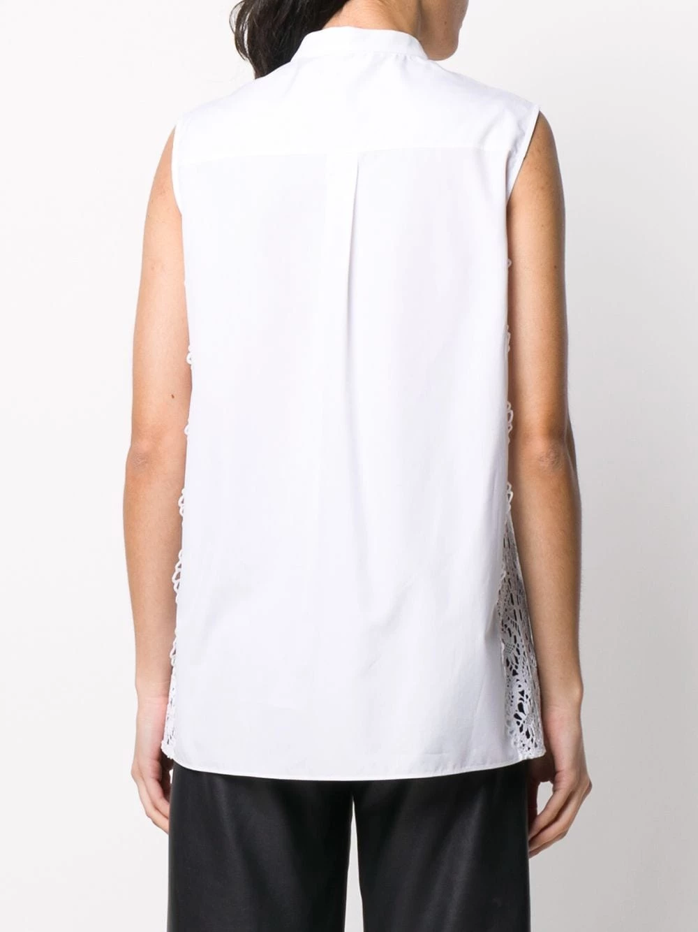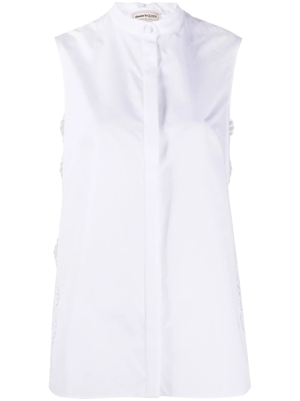You’ll catch us wearing this white cotton lace inserts sleeveless shirt from Alexander McQueen during our Saturday afternoon activities, which includes a terrace, friends and cocktails. We’ll be the ones soaking up the sun. Featuring a sleeveless design, a mandarin collar, a concealed button fastening, a curved hem and lace inserts to the sides.
