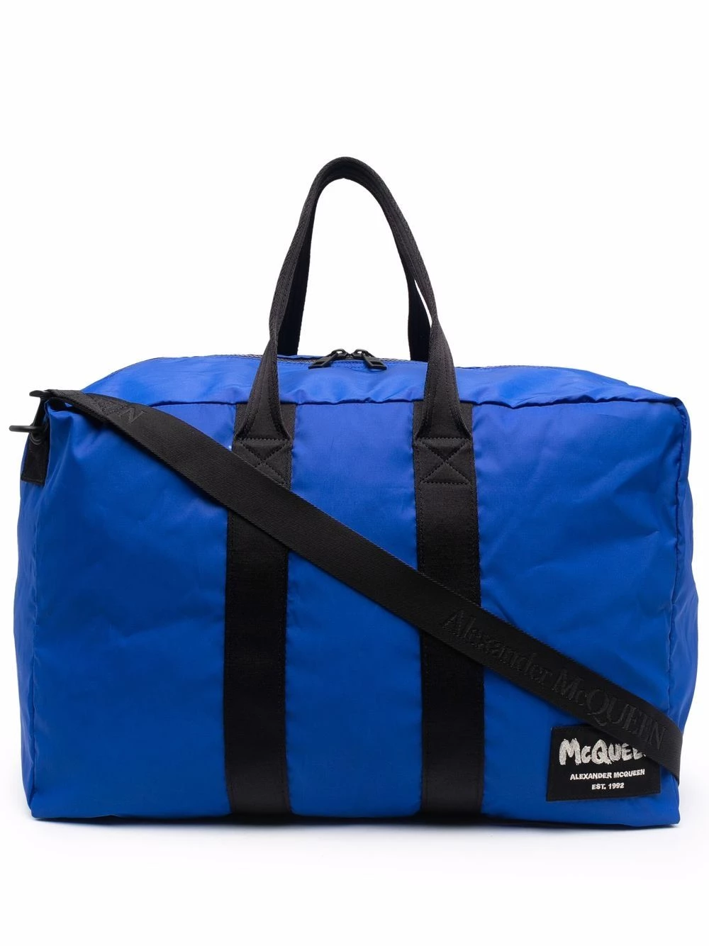 Ultramarine blue logo-patch zipped holdall from Alexander McQueen featuring logo patch to the front, top zip fastening, two rounded top handles, single shoulder strap and main compartment.