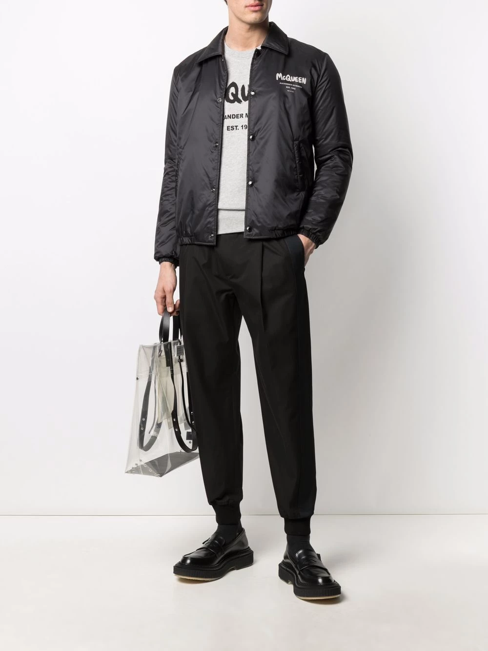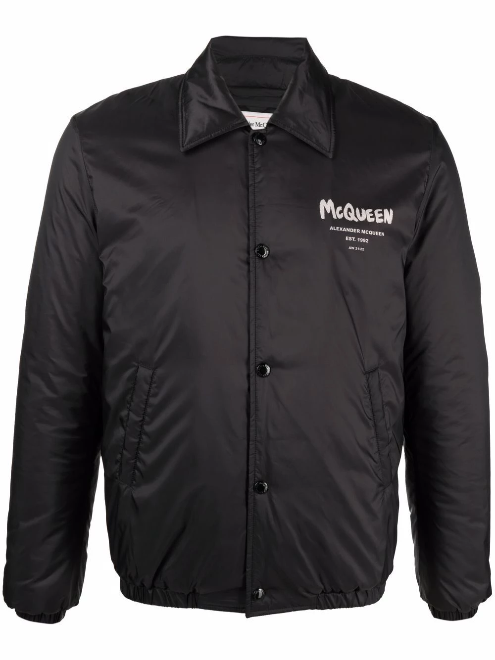 Alexander McQueen’s Graffiti logo adorns this bomber jacket at the chest and back. It has been crafted from shiny shell fabric that adds a technical feel to the design.