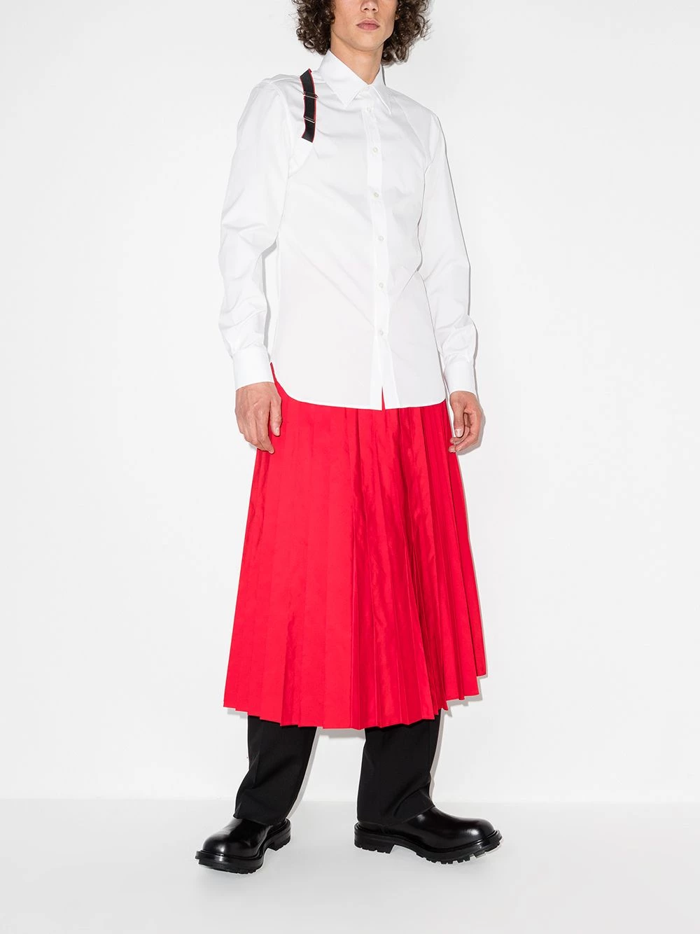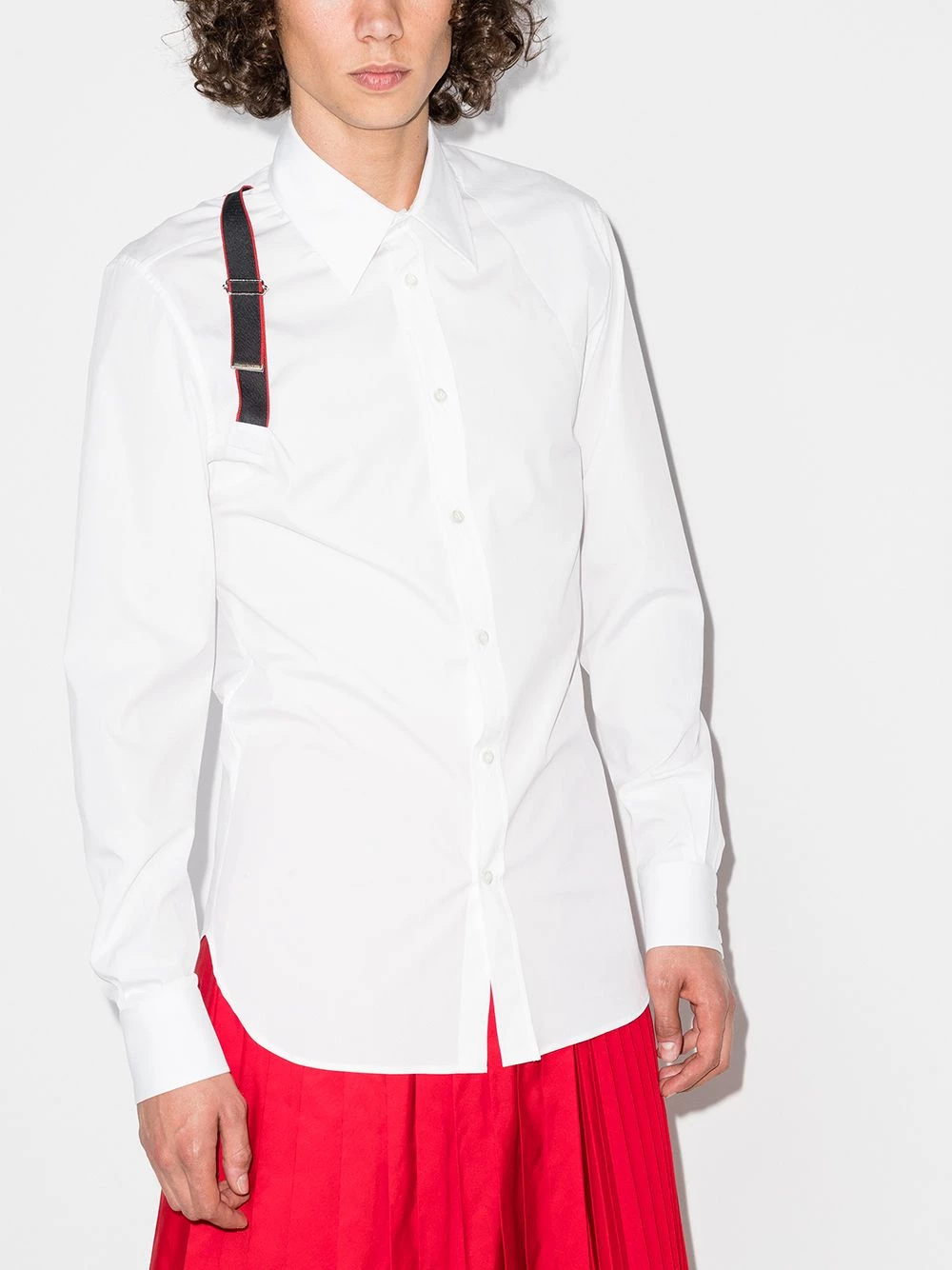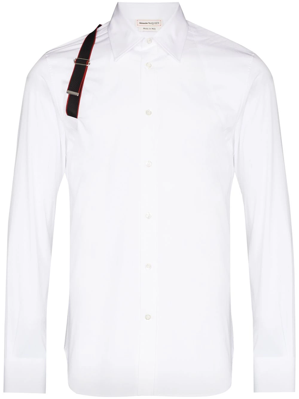 Alexander McQueen experiments with tailoring, as seen here on this shirt designed with a logo tape harness detail positioned at the shoulder. Whilst a pointed collar, and button cuff sleeves are recognisable features of this smart look.