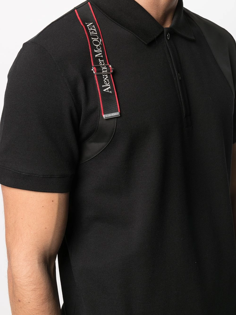 A wardrobe staple with a twist. Stand out from the regular polo shirt crowd thanks to the logo tape and safety pin at the sleeve of this Alexander McQueen number. Blending in is not an option.
