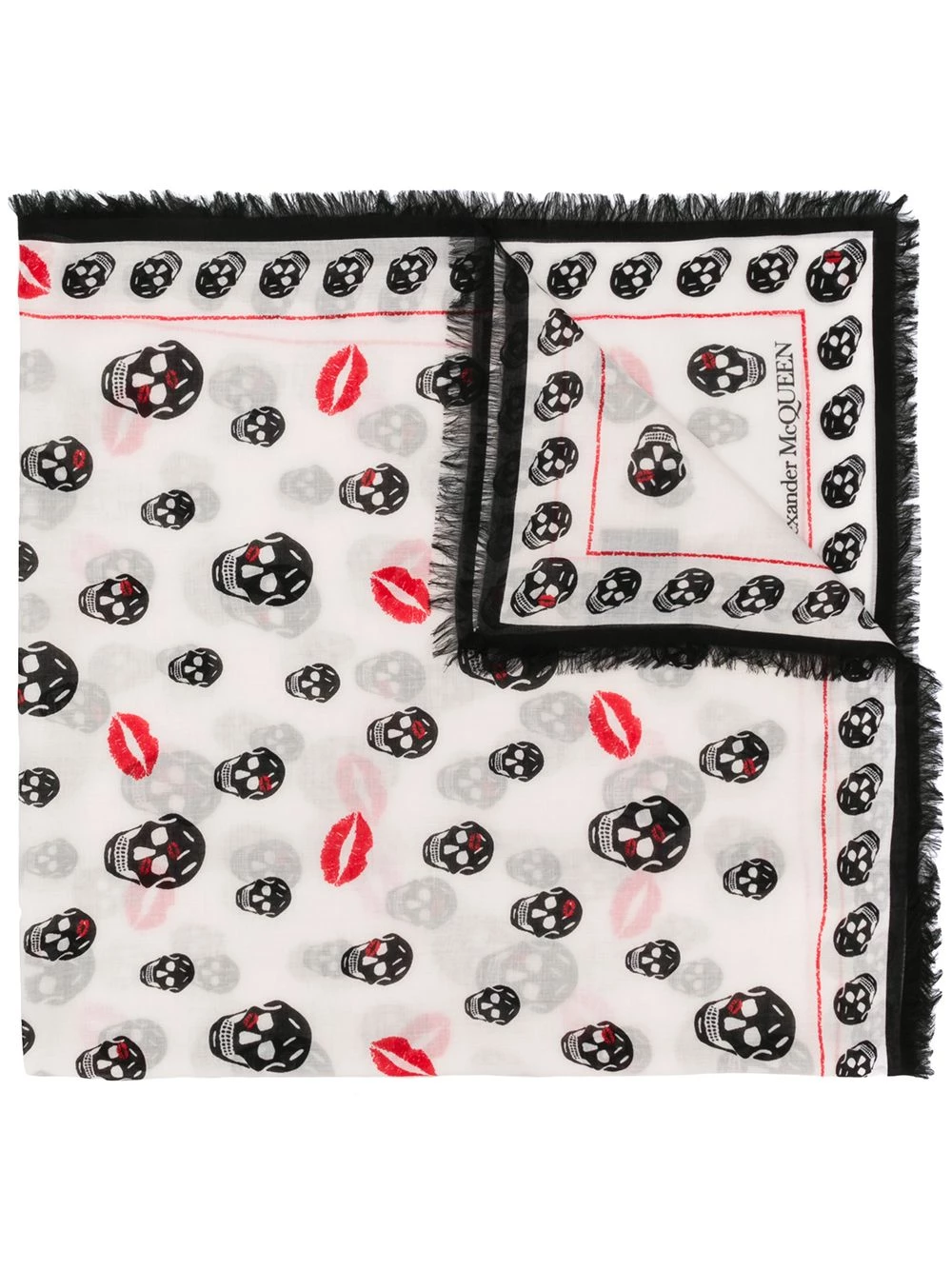 Incorporate Alexander McQueen’s signature skull motif into everyday looks with this iconic black, red and white scarf. Featuring fringed edges and a logo print, this coveted skull and lips stamped piece exudes edge and sophistication; trademarks of the Alexander McQueen brand.