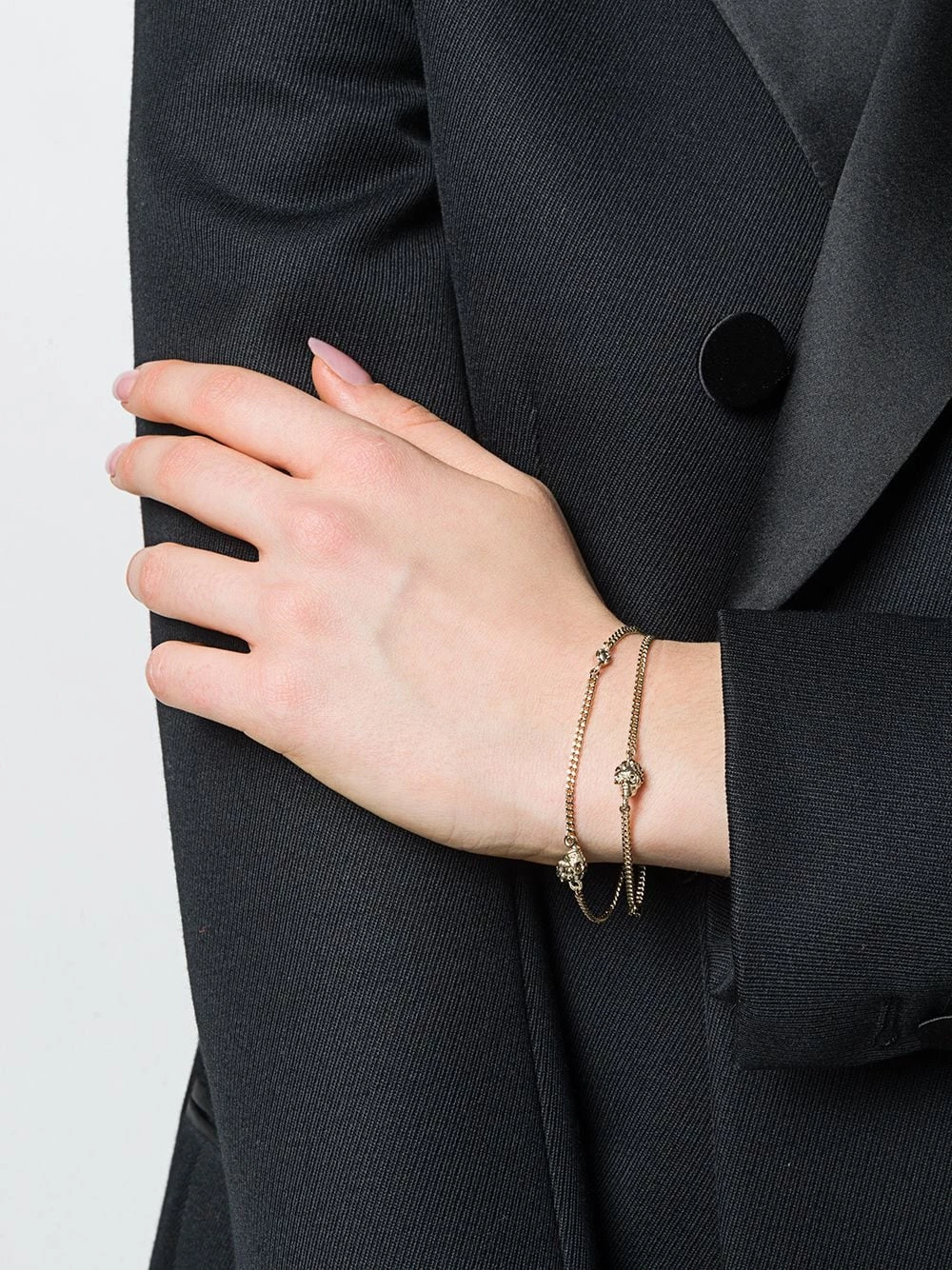 Discover the darkly alluring aesthetic of Alexander McQueen in the latest collection. Theatrical designs feature intricate, opulent detailing and gothic motifs. Constructed from gold-toned brass, this bracelet is adorned with crystal-embellished skulls that will give any look an edgy twist.