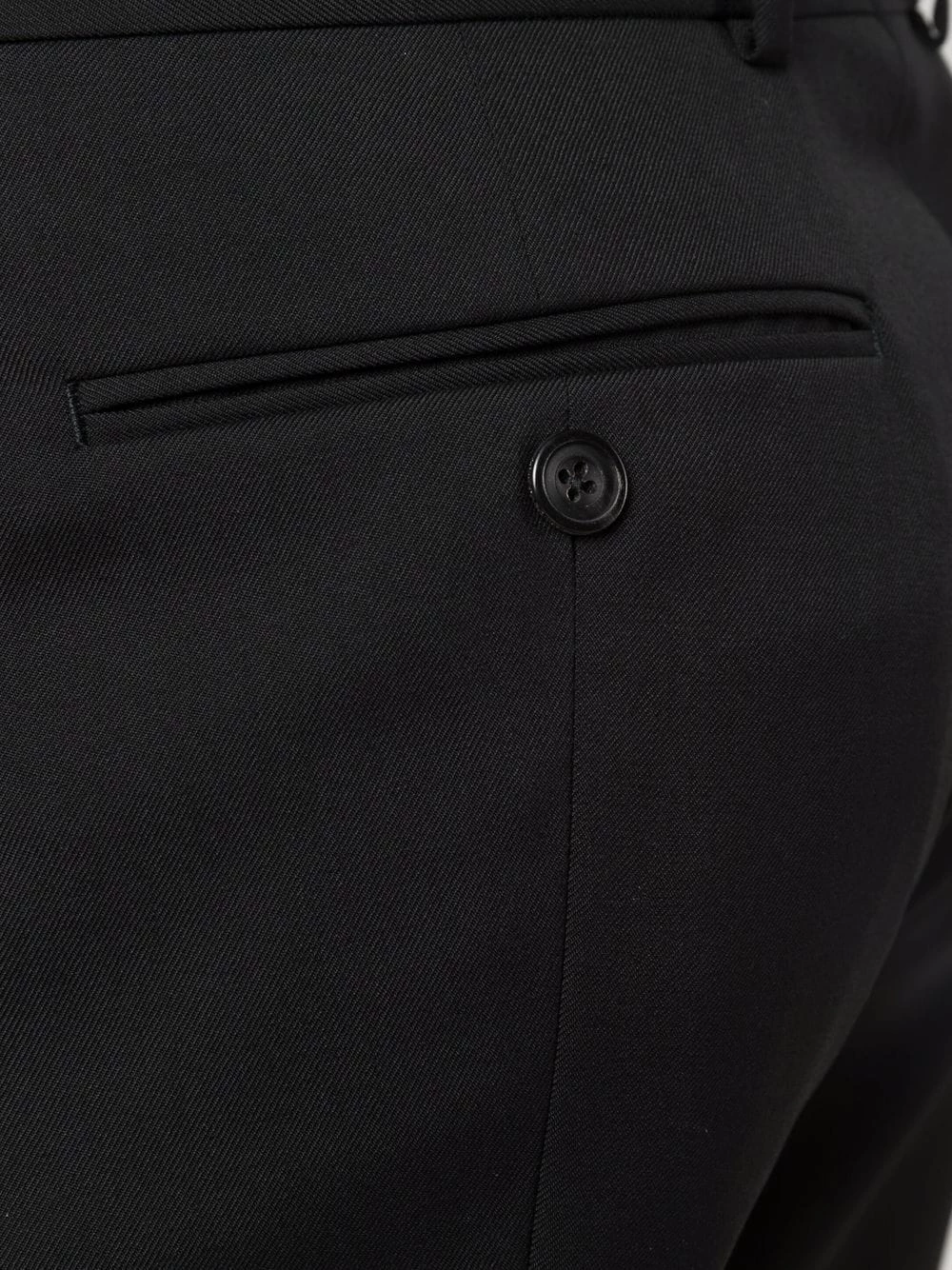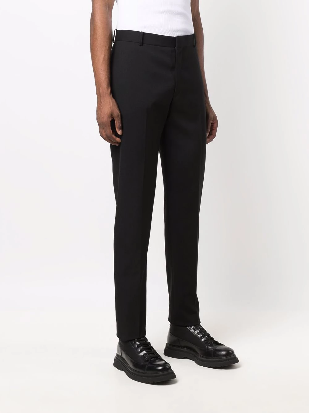 Black cotton/wool/cupro tailored-fit regular-length trousers from Alexander McQueen featuring mid-rise, belt loops, concealed front fastening, slip pockets to the sides, two rear button-fastening jetted pockets and pressed crease.