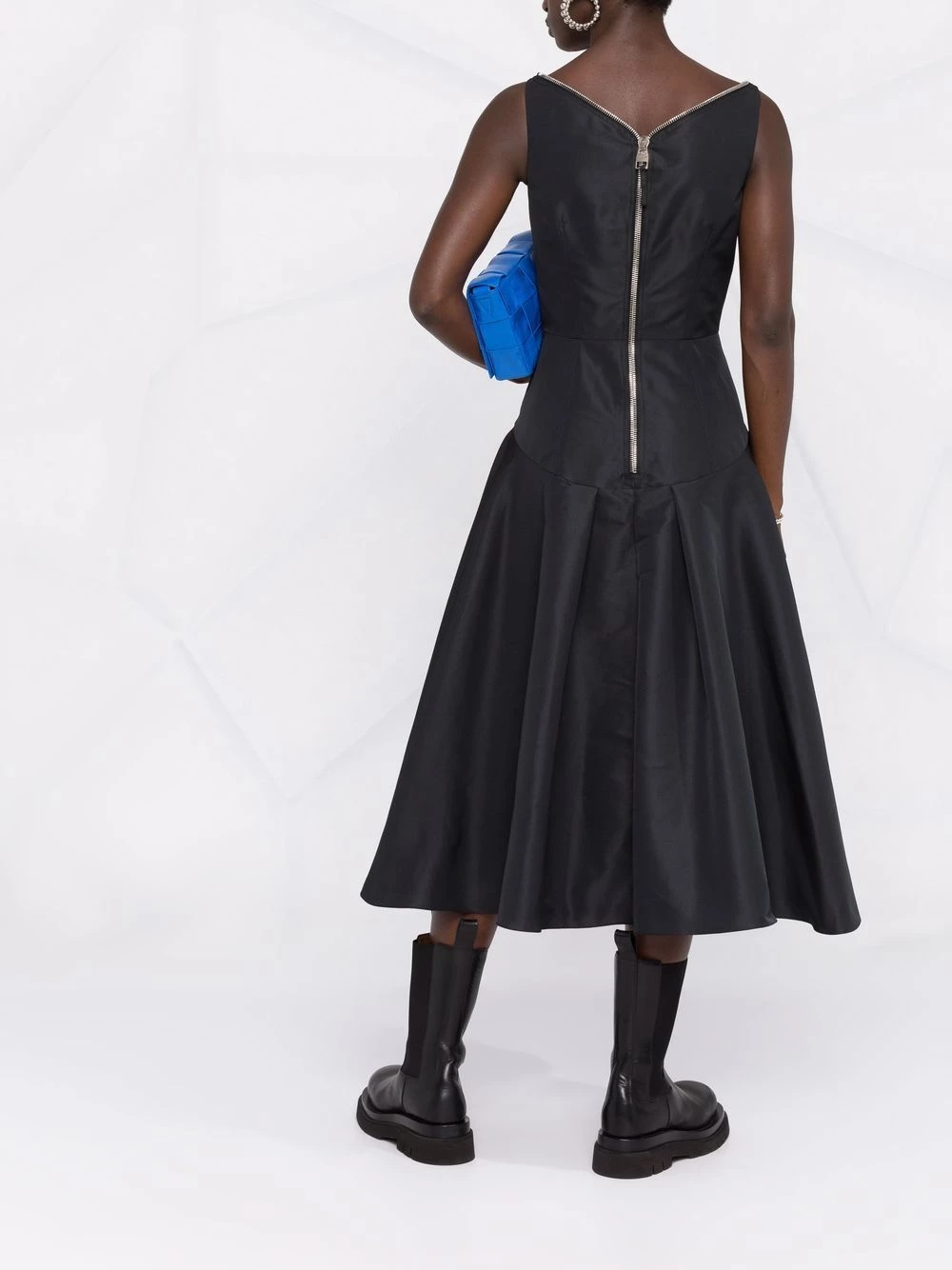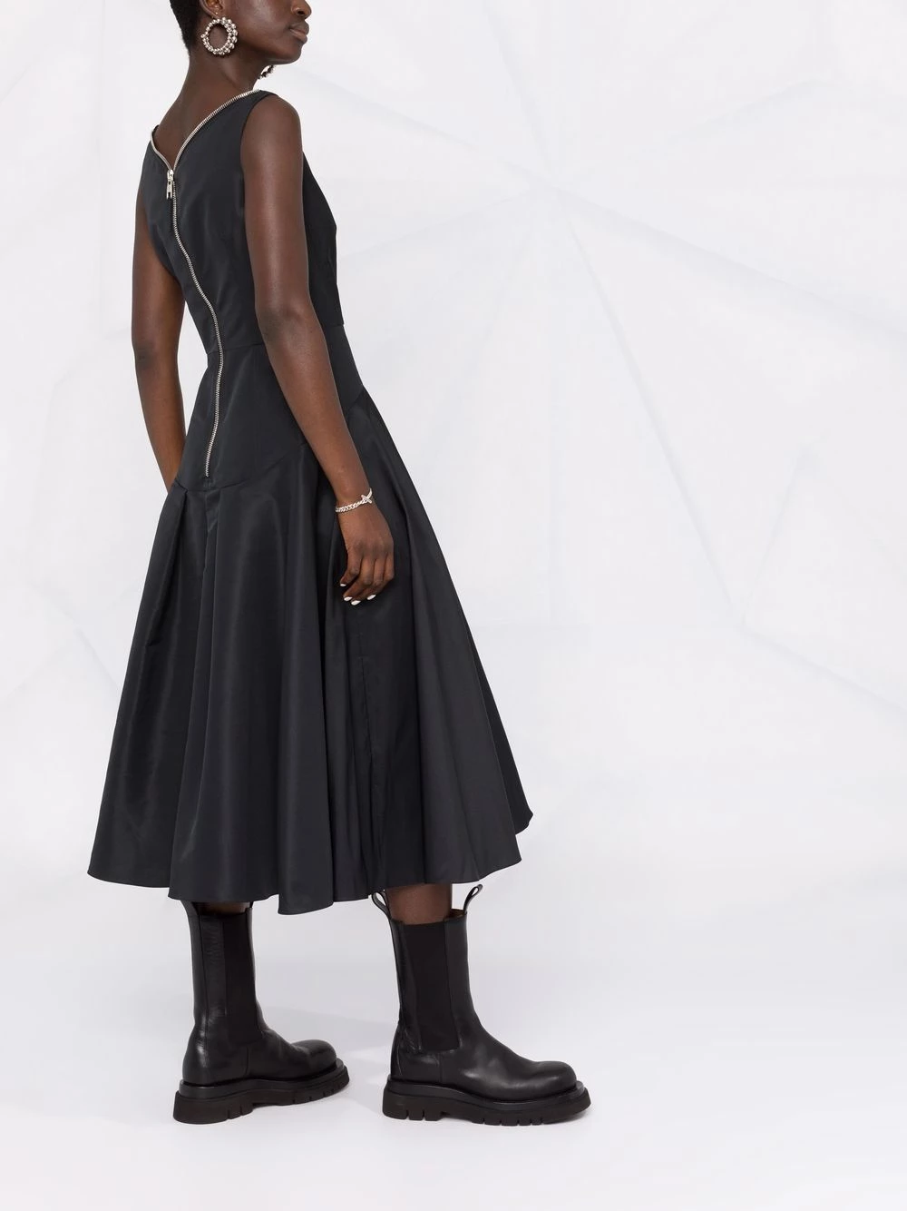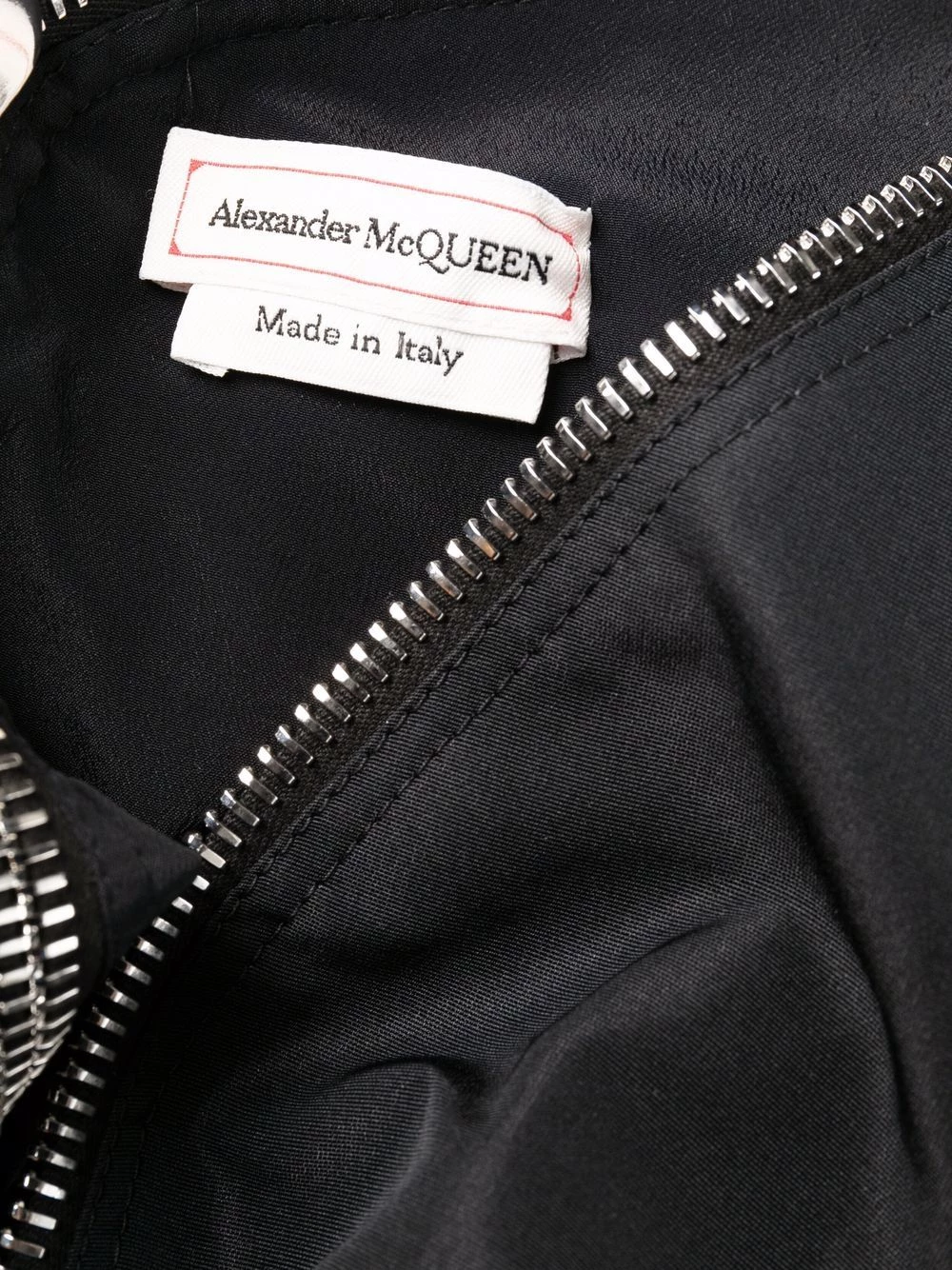 This black silk dress from the latest collection from Alexander McQueen strikes the perfect balance between refined and punk aesthetics. The exposed front two-way zip fastening and rear zip bring an edgy touch to this voluminous flared silhouette.