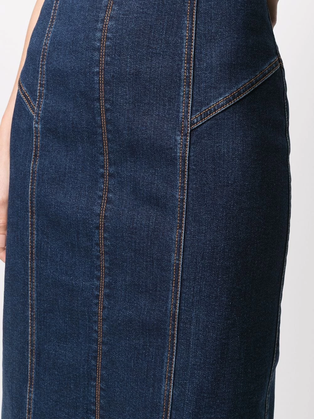 Swap out your usual jeans for some pretty denim. This blue stretch cotton-denim panelled mid-length denim skirt from Alexander McQueen reveals a ruffle hem on the rear. It deserves pride of place in your wardrobe.